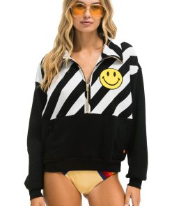 Aviator Nation Women’s Tops Caution Smiley 2 Embroidery Fleece Half Zip Sweatshirt – Black // Whit