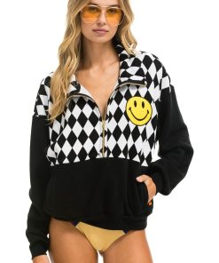 Aviator Nation Women’s Tops Diamond Smiley 2 Embroidery Fleece Half Zip Sweatshirt – Black // Whit