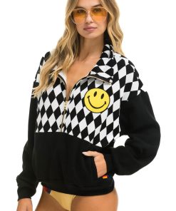 Aviator Nation Women’s Tops Diamond Smiley 2 Embroidery Fleece Half Zip Sweatshirt – Black // Whit