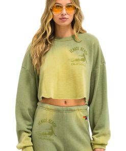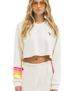Aviator Nation Women’s Tops Rugby Stitch Cropped Crew Sweatshirt Relaxed – Vintage White // Neon