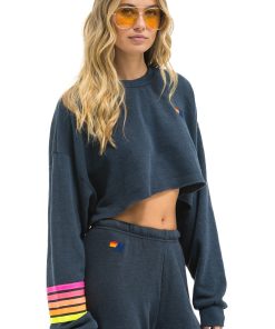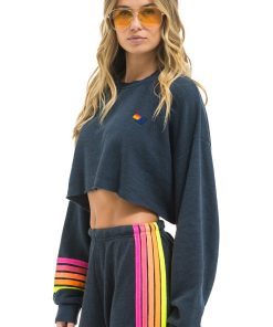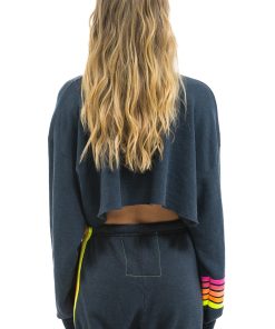 Aviator Nation Women’s Tops Rugby Stitch Cropped Crew Sweatshirt Relaxed – Charcoal // Neon