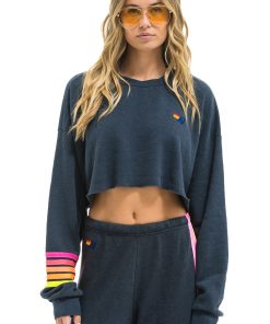 Aviator Nation Women’s Tops Rugby Stitch Cropped Crew Sweatshirt Relaxed – Charcoal // Neon